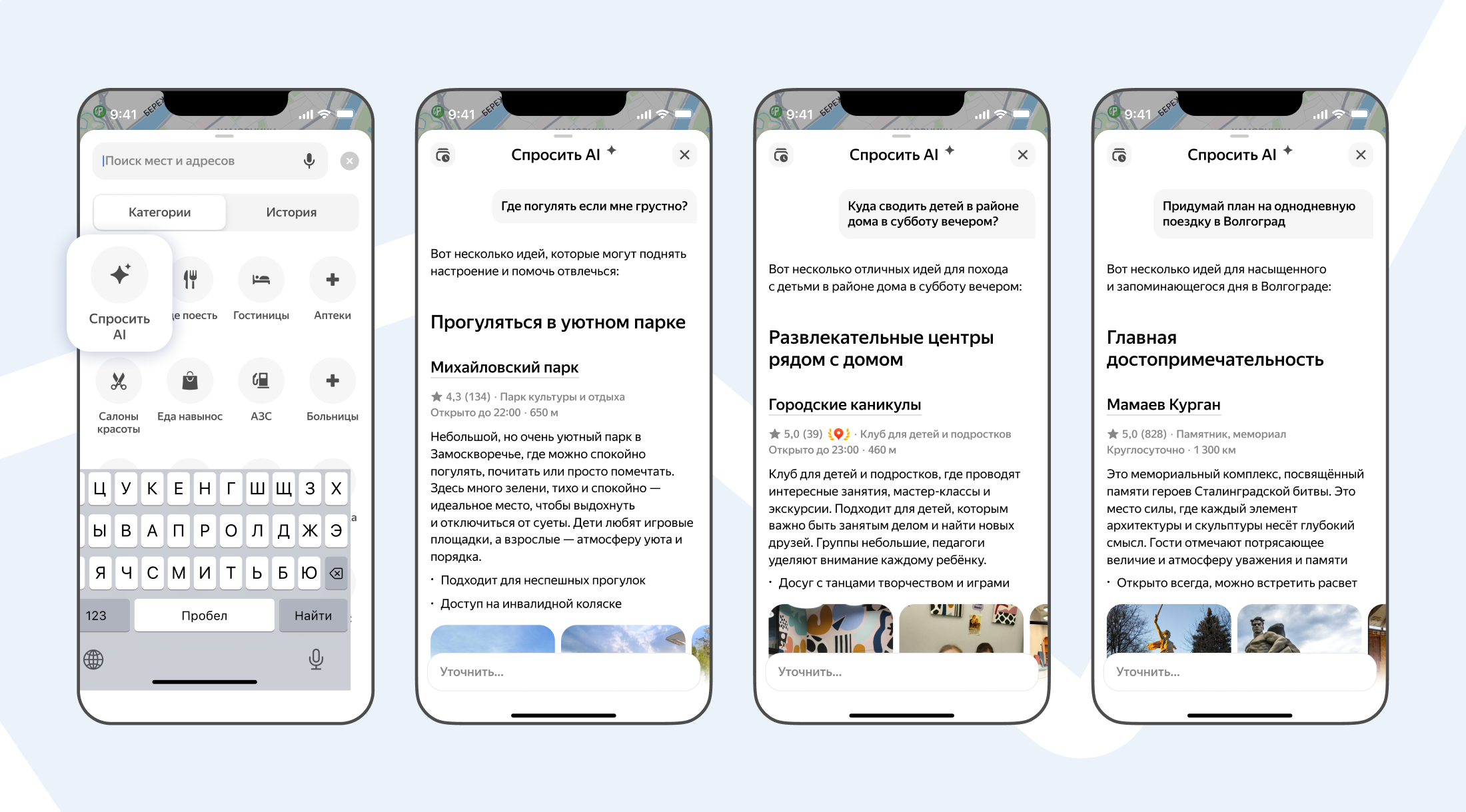 Как рассказали в пресс-службе, ИИ помогает планировать досуг, предоставляя подборки и обзоры мест, а также может составить план дня в поездке. Он понимает сложные запросы, учитывает контекст и пожелания пользователя, например, «Куда сходить с детьми в районе дома в субботу вечером?» или «Где нам с друзьями встретиться, если я живу на Соколе, а они — на Белорусской?»