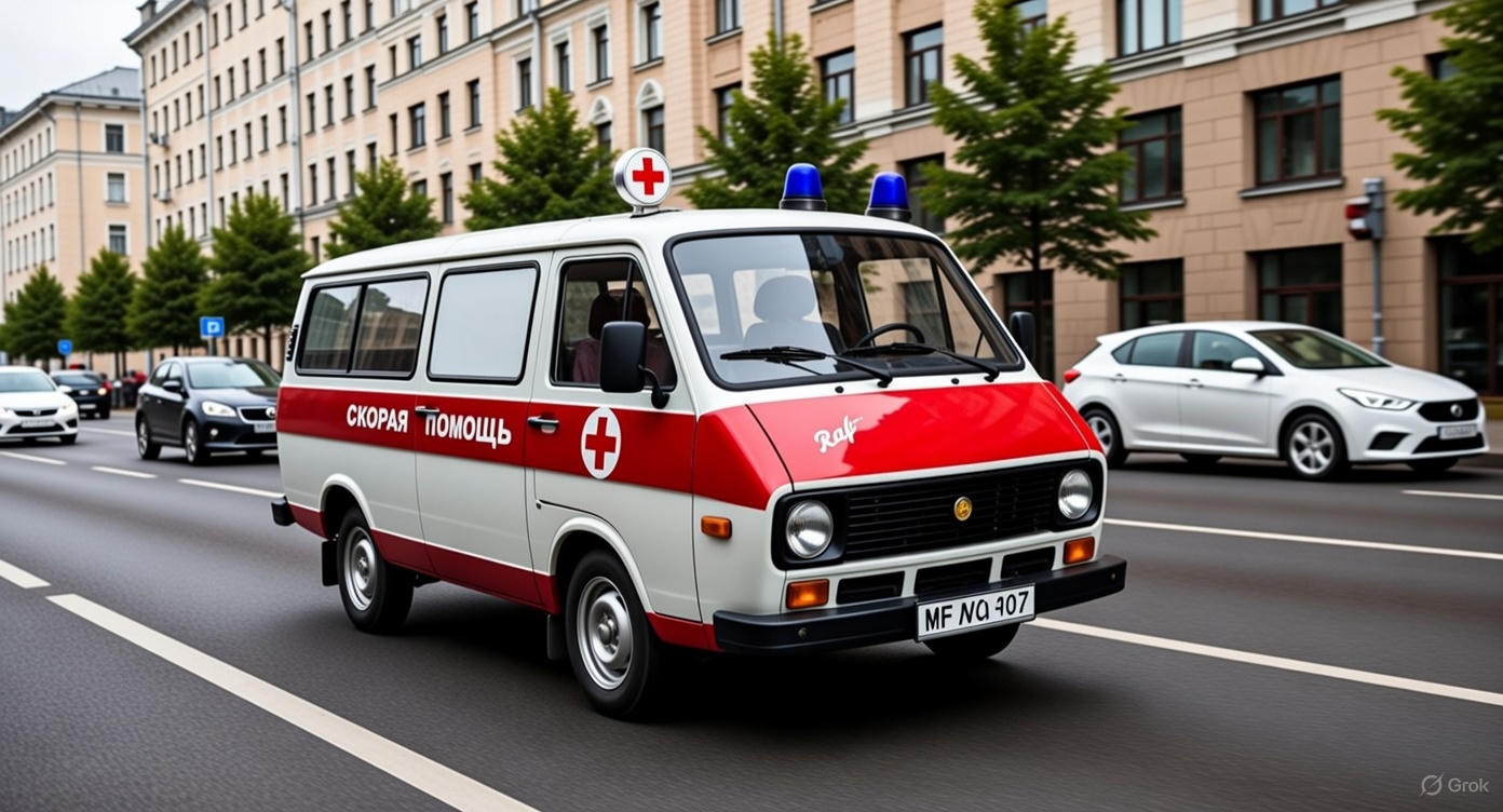 В столице обнаружился коллекционный микроавтобус РАФ-2203 с пробегом всего 5000 км. Особенность автомобиля — оформление в стиле скорой помощи.