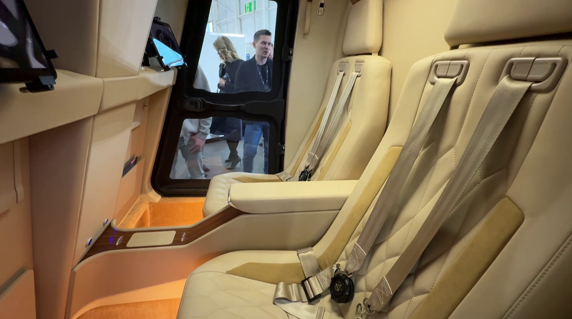 Внутри установлены четыре больших кресла. Между сиденьями заднего ряда установлена большая центральная консоль, перед пассажирами — экраны. Выглядит салон как в машинах бизнес-класса. Для размещения багажа предусмотрены специальные отделения.