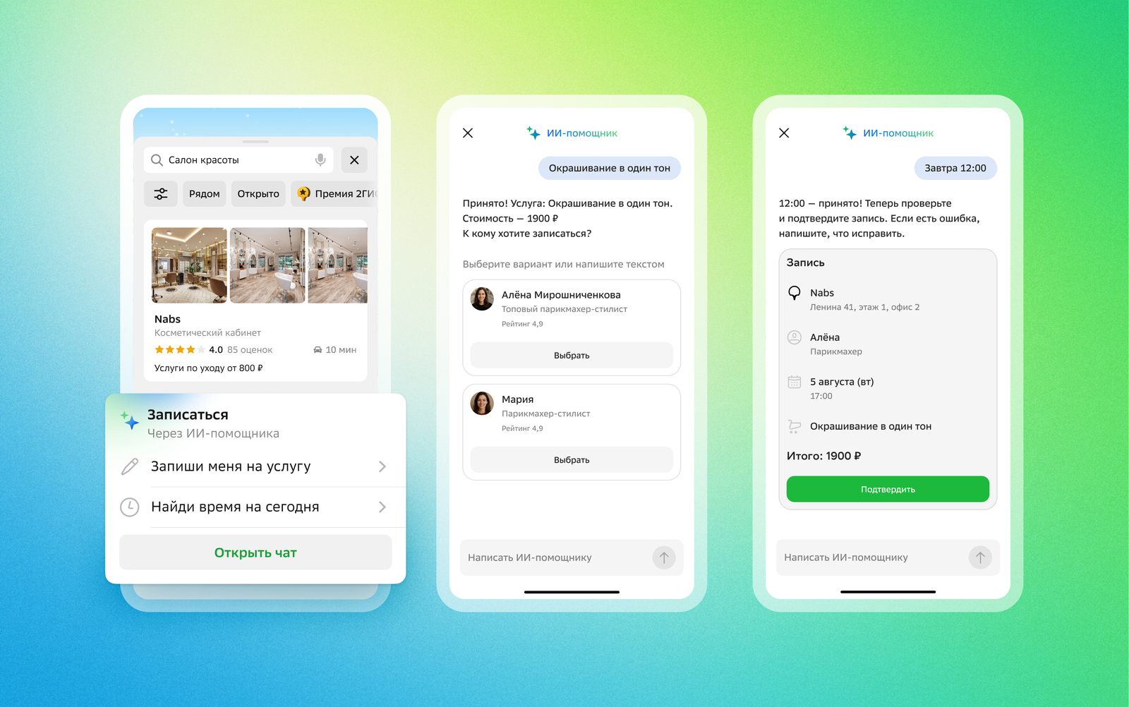 Пользователи, которым доступна новая функция, могут записаться на услугу за пару минут. В чате ИИ-ассистент уточняет детали, предлагает удобные дату и время, помогает выбрать специалиста и оформляет запись. В Новосибирске тестируется еще один способ записи — когда пользователь сначала указывает свои предпочтения, а помощник подбирает подходящую компанию и записывает на услугу.