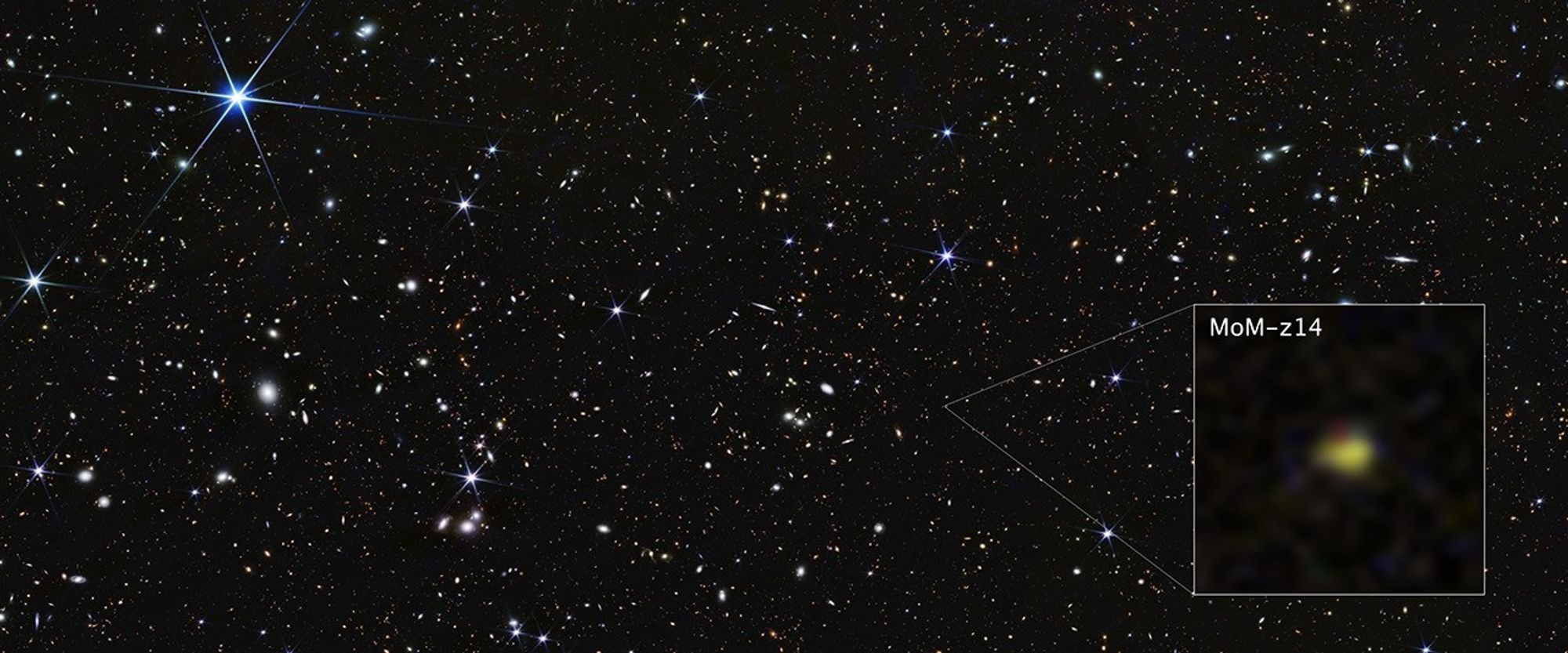 Астрономы с помощью космического телескопа «Джеймс Уэбб» (JWST) обнаружили самую далёкую из известных на сегодняшний день галактик — объект MoM-z14. Свет от неё шёл к Земле около 13,5 миллиарда лет, а сама галактика существовала всего через 280 миллионов лет после Большого взрыва. Для сравнения: Млечный Путь начал формироваться примерно через 800 миллионов лет после рождения Вселенной.