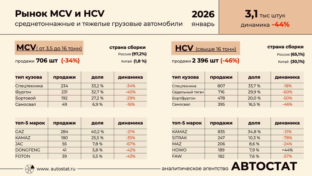 Российский рынок новых грузовых автомобилей начал 2026 год со спада: в январе на учет встало всего 3,1 тысячи машин, что на 44% меньше показателей января 2025 года. Интересно, что если ранее большинство продаж на рынке обеспечивали магистральные тягачи, то теперь рынок смещается в сторону спецтехники.