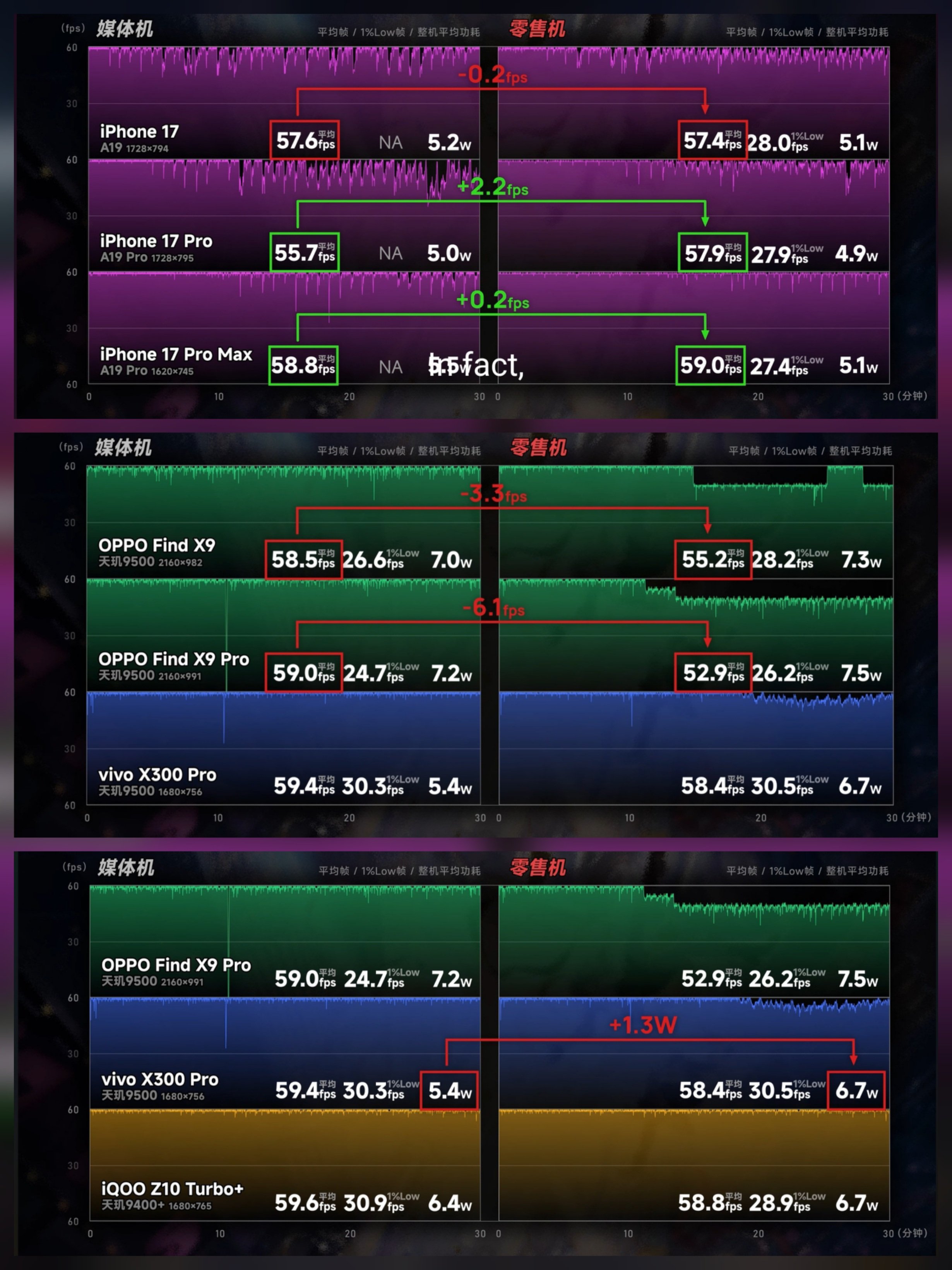 Авторы сравнили iPhone 17/17 Pro/17 Pro Max с Oppo Find X9/X9 Pro, iQOO Z10 Turbo+ и Vivo X300 Pro. Сравнивались результаты в играх и бенчмарках, которые демонстрировали блогеры в первые дни, то есть имевшие образцы аппаратов до старта продаж, с результатами уже обычных розничных смартфонов.