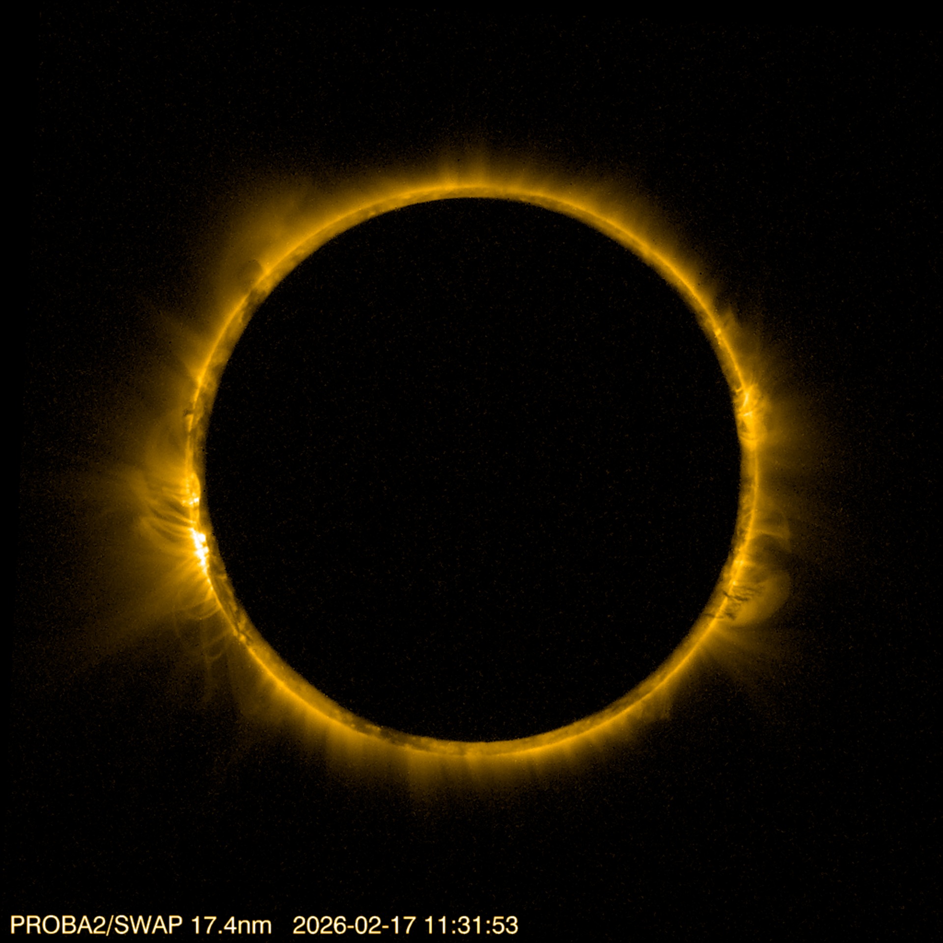 17 февраля 2026 года Луна прошла между Солнцем и Землёй, вызвав редкое кольцевое солнечное затмение. В этот момент спутник Proba-2 Европейского космического агентства (ESA), находящийся на орбите, четыре раза наблюдал затмение, включая идеальное «огненное кольцо» в 11:31 по всемирному времени.