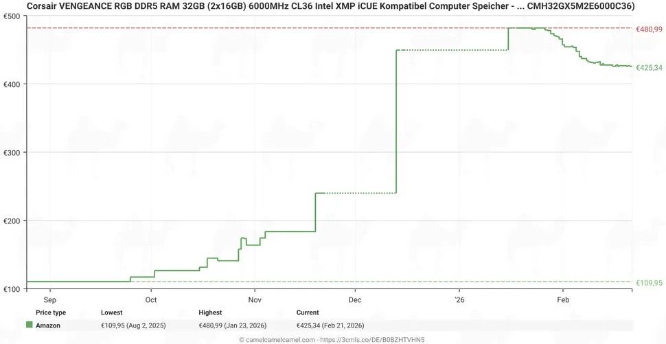 На графике ниже можно видеть совокупные цены на некий условный средний комплект оперативной памяти DDR5 объемом 32 ГБ по всему Европейскому союзу в период с конца июля 2025 года по февраль 2026 года.