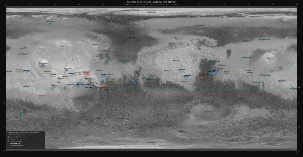 Все события группируются вблизи марсианских равноденствий и в пределах ±9° от экватора, что связано с орбитальными наклонами спутников. Теоретический предел для наблюдателя составляет ±13,1° широты: выше этой зоны двойные транзиты невозможны. Следующее частичное событие ожидается 17 апреля 2034 года, а ближайший полный двойной транзит — только 20 ноября 2118 года, когда оба спутника окажутся полностью на диске Солнца на фоне плато Большой Сирт (Syrtis Major).