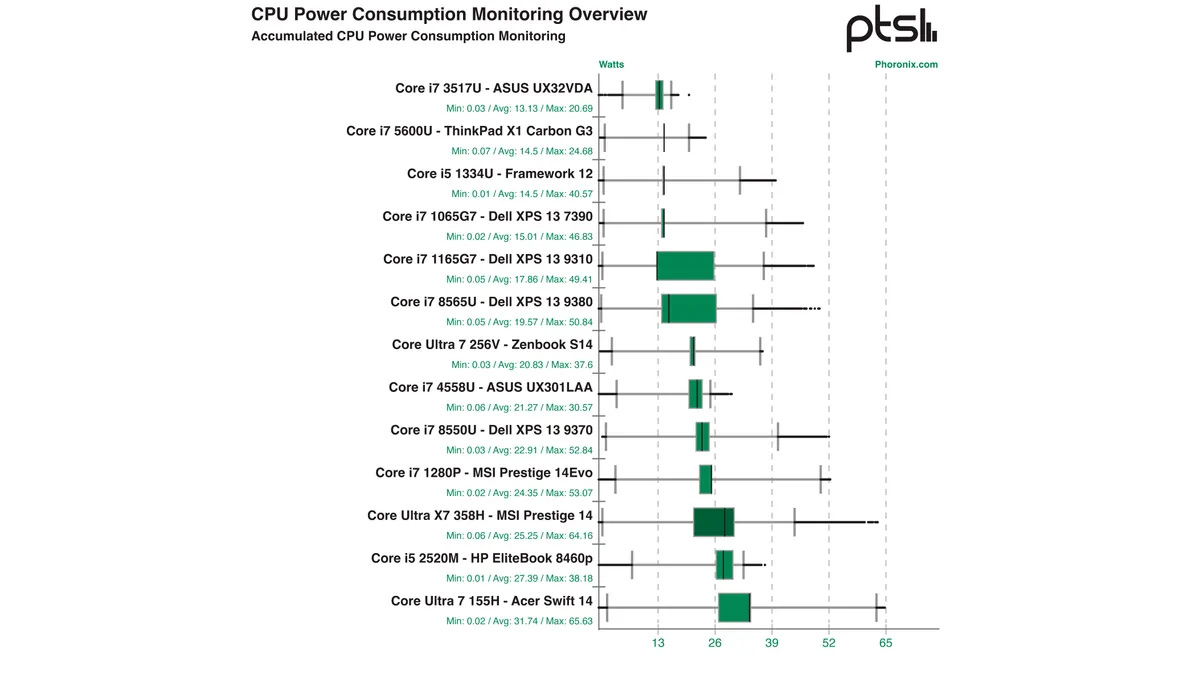 Ресурс Phoronix провел большое тестирование 15 мобильных процессоров Intel разных поколений — выпущенных в период с 2008 по 2026 год. Исследователи проследили путь развития технологий от 45-нанометровой архитектуры Penryn (Core 2 Duo T9300) до новейшей 18A-архитектуры Panther Lake (Core Ultra X7 358H). Все устройства работали под управлением Ubuntu 26.04 и прошли через 150 различных тестов — от обычного просмотра интернет-страниц до задач ИИ и управления базами данных.