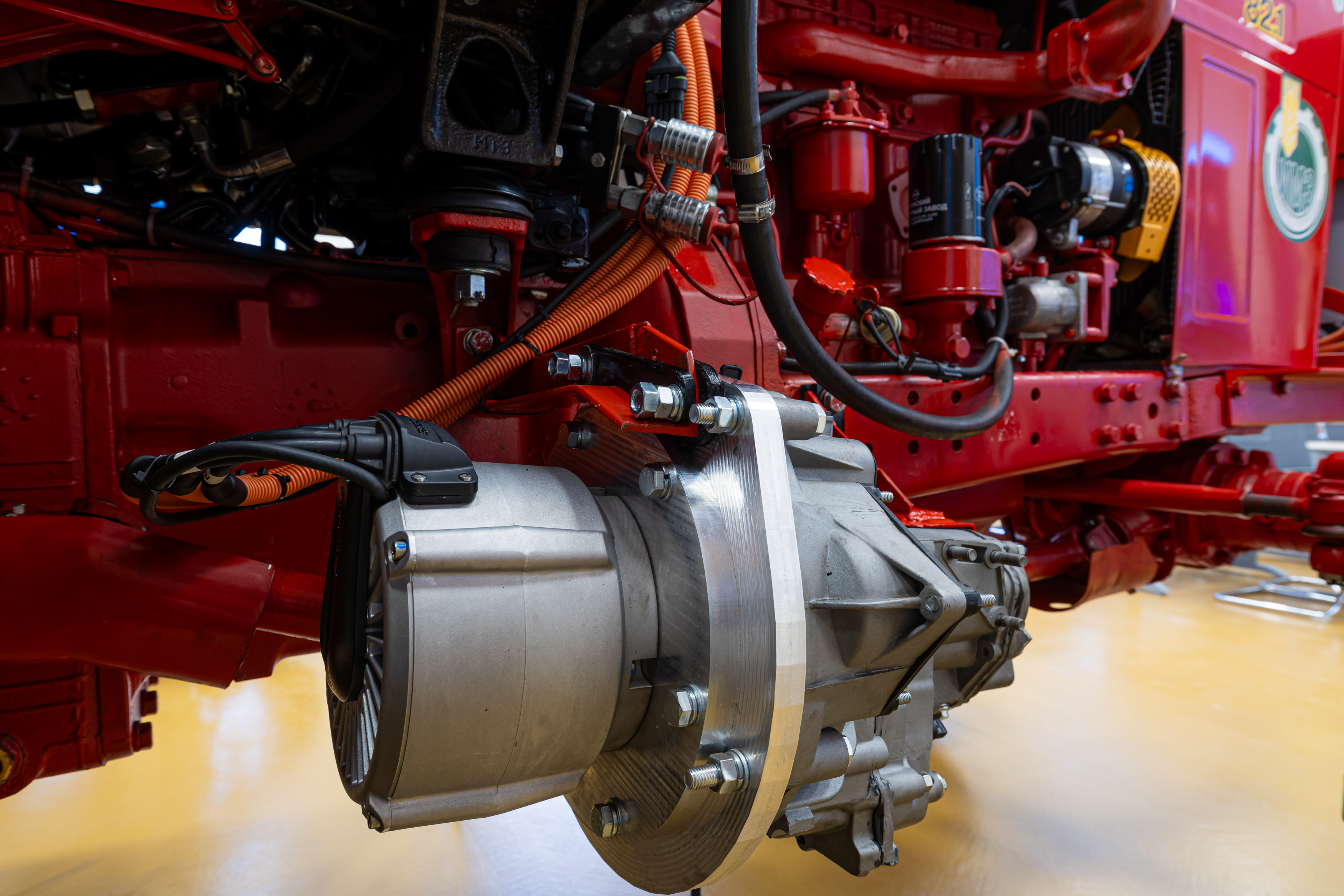 Новинка построена по схеме параллельного гибрида: машина может работать только на дизеле, только на электротяге или в комбинированном режиме. Трактор оснастили электромотором мощностью 30 кВт (около 40 л.с.), а общая мощность силовой установки достигает 136 л.с. То есть модернизированный МТЗ-82.1 по мощности сравним с тяжелым трактором МТЗ-1221 с шестицилиндровым двигателем.