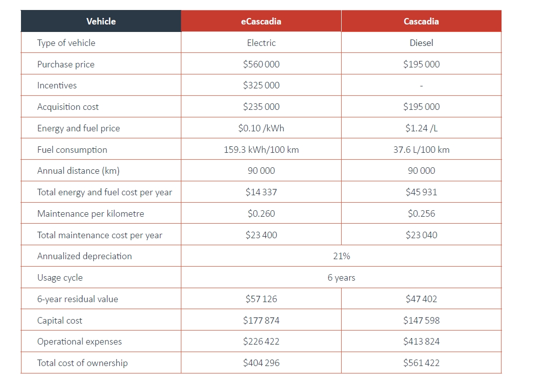 Как можно видеть по таблице, затраты на топливо у дизельных тягачей были втрое выше. Согласно этим результатам получается, что, с учётом государственных субсидий на закупку и развитие инфраструктуры, электрогрузовики этого класса могут приблизиться к ценовому паритету с дизельными автомобилями в течение шестилетнего срока службы при условии, что годовой пробег составит примерно 74 000 километров. При этом чем выше пробег, тем выгоднее будет электрическая версия.