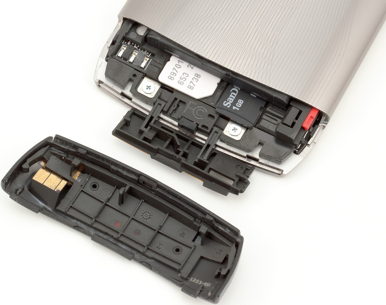 Совершенно неожиданно оказалось, что вытащить из телефона SIM-карту — большая проблема. Она вставляется в паз под батарею, как и карта MicroSD. Однако у MicroSD разъем подпружинен, к тому же у карточки есть бортик, за который ее можно вытянуть из слота. А слот SIM-карты не подпружинен и к тому же довольно тугой, тем более что наружу торчит совсем небольшая ее часть. Достать ее можно либо пинцетом, либо уцепившись за поверхность и прикладывая большое усилие. В общем, в полевых условиях сделать это очень сложно. Если потянуть за красный флажок (на фото справа), то из-под корпуса выдвинется батарея.