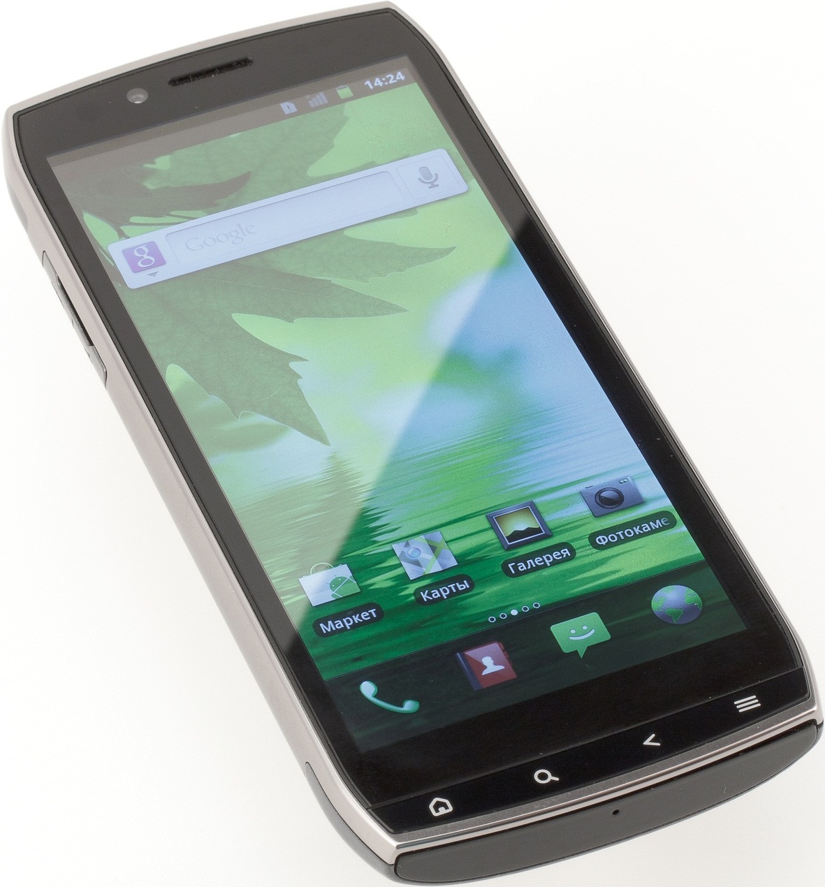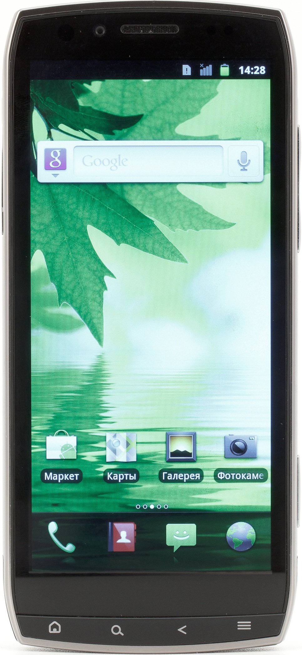 Под экраном расположены четыре кнопки управления, вполне традиционные для Android: домой, поиск, назад и меню. Обращаю внимание, что кнопки не сенсорные. Хотя пластиковая панель единая, кнопки под ней механические, и при нажатии на одну из них прогибается вся панель. Кнопки подсвечиваются, но подсветка быстро гаснет и не всегда включается, так что в темноте их приходится нажимать наощупь.