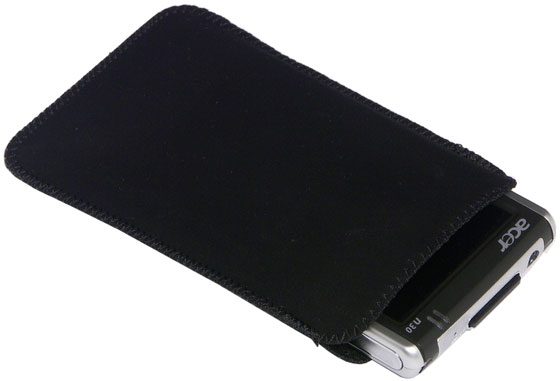 Средних размеров коробка содержит КПК со встроенным аккумулятором, чехол (два прямоугольных куска тряпки, сшитых с трех сторон), зарядное устройство, кабель для синхронизации с разъемами USB client/host, CD с программами и толстую пачку бумаг. С одной стороны, комплект скромен до безобразия. С другой кабель USB host не всегда имеется даже в поставке топовых моделей! А чехол всегда можно купить отдельно. Единственный по-настоящему серьезный Acer отсутствие в комплекте переходника с пока еще не ставшего стандартом джека 2.5" на миниджек 3.5".Дизайн и конструкция