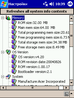- Microsoft Windows Mobile 2003 (Windows CE 4.20, сборка 14053). Напомним, что модель первоначально вышла на рынок в середине 2004 года. О возможности апгрейда до WM2003SE данных нет. Очевидно, что на такой шаг Acer не пойдет. Да и нужен ли он?
