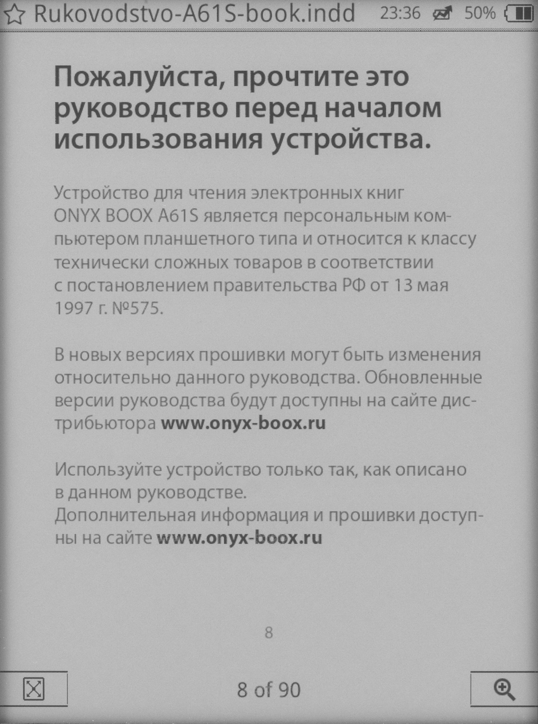 Просмотр PDF на 6″ экране Onyx по удобству можно сравнить с Kindle, но только с точки зрения размера экрана. Также приходится разворачивать изображение в ландшафтную ориентацию, чтобы текст был читабельным. Но иногда при просмотре возникают проблемы. Самый удобный режим чтения PDF в Onyx — режим «свитка», когда текст идет сплошной полосой, без разбиения на страницы, т. е. страницы как бы склеиваются. Применяя в тандеме с этим режимом опцию «По ширине», читать PDF наиболе комфортно. Но при длительном нажатии на кнопку Next (для пролистывания сразу на несколько страниц вперед) форматирование сбивается — текст начинает выходить за края экрана, и приходится заново заходить в настройки. В Kindle есть очень удобная возможность увеличения и уменьшения контраста изображения (действует как на картиночные, так и на текстовые PDF) — за счет увеличения контраста читать порой становится удобнее. В Onyx этой возможности не имеется.