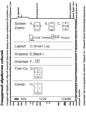Одной из проблем, которые мешают нормально пользоваться этой оболочкой, является кривое отображение русскоязычных документов — между буквами слишком большие расстояния, читать такие документы нет никакого смысла, проще переконвертировать в MOBI или читать при помощи FBKindle. Но для русских пользователей Duokan может быть интересен с точки зрения чтения PDF и DJVU — они отображаются очень хорошо. Реализация просмотрщика этих форматов — это на данный момент практически эталон функциональности просмотрщика таких файлов. Во всяком случае, для экранов с малой диагональю. Судите сами. Есть полноценный и нормально работающий режим свитка, когда страницы идут одна за другой. Имеется гибкая регулировка четкости отображаемой информации (текст и прочее отображаемое на экране можно делать жирнее). Есть режим Reflow, который позволяет переформатировать текст из текстовых PDF, таким образом можно увеличивать шрифт без боязни потерять часть текста за краем экрана (хотя не всегда этот режим приносит пользу). Удобная реализация чтения многоколоночных PDF и двухколоночных комиксов. Но самое главное — это удобная ручная обрезка пустых краев справа и слева при чтении в ландшафтной ориентации. Она позволяет убрать ненужную информацию, таким образом, для текста становится больше места, шрифт укрупняется, и читать становится удобнее.