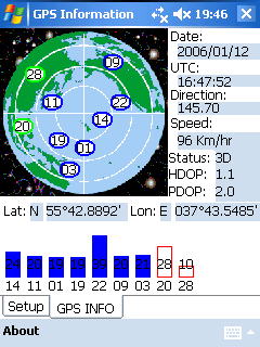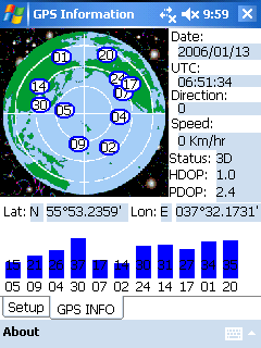 С использованием приемника внутри помещений возникли проблемы. Даже при расположении КПК вблизи окна устойчивого приема добиться не удалось. Сигнал поступал от 2-3 спутников, скорее всего отраженный и низкой мощности, определения координат не происходило. Уже в нескольких метрах от окна приемник становился полностью слепым.