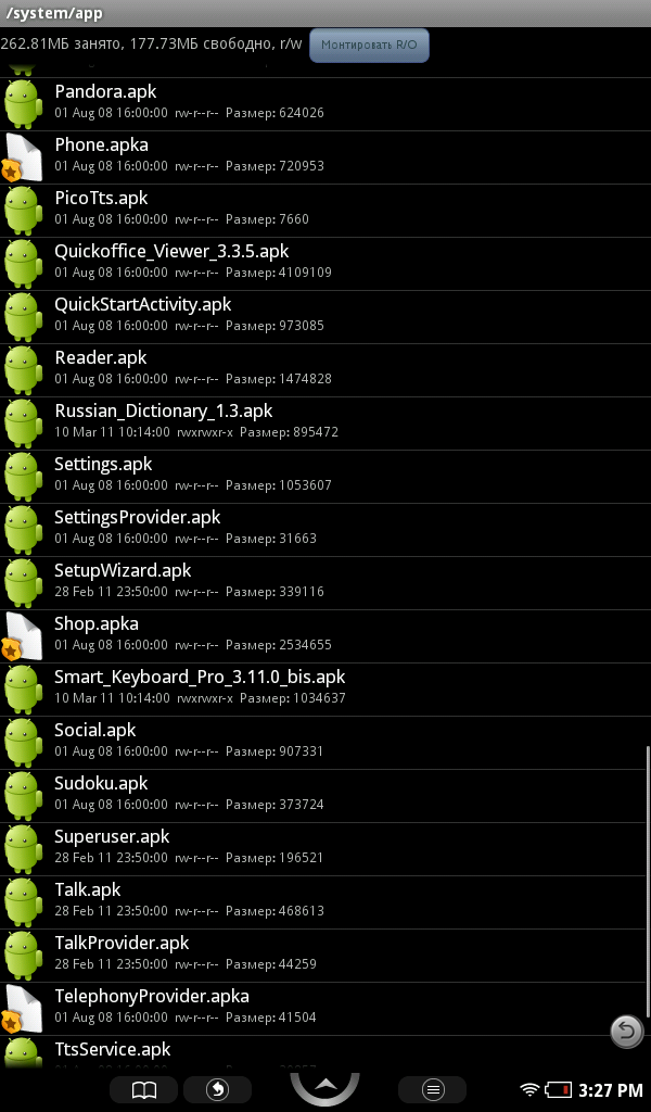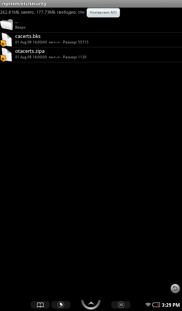 Дальнейшая работа по взлому весьма проста: открываем в Root Explorer папку /system/app, нажимаем кнопку «mount r/w» и меняем тип файла Shop.apk на любой другой. Аналогичные действия в этой папке производим с файлами Phone.apk и TelephonyProvider.apk. Теперь переходим в папку /system/etc/security и там меняем otacerts.zip. Зачем мы все это делаем? проблема в том, что приложение Shop способно обнулить все наши труды до состояния заводской прошивки, решив, что устройство было испорчено случайно. Пакет otacerts отвечает за автообновление устройства, что также нежелательно в условиях новой системы. Что же касается телефонных программ, то их отключение мы производим, чтобы они не тратили напрасно энергию аккумулятора.