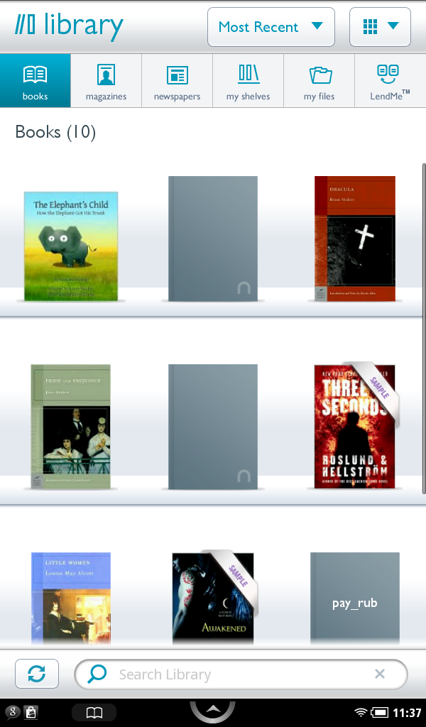Помимо рабочего стола существует и отдельное приложение библиотеки. Здесь литература разделена по типам: книги, журналы, газеты, а также есть собственный раздел «My Shelves», выбор прочих документов «My files» и закладка «LendMe» (функция, позволяющая делиться купленными книгами с друзьями). Каждый раздел содержит полки, на которых и стоят имеющиеся в библиотеке книги.