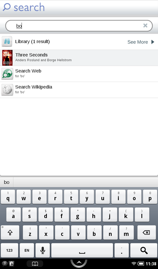 Для поиска конкретных книг можно пользоваться специальным сервисом Search, расположенным далее по главному меню. Здесь достаточно просто ввести требуемое название, чтобы электронная книга автоматически перебросила вас к нужной книге в приложении Shop. Впрочем, поиск производится и во внутренней памяти устройства, а также работает для любых других типов совместимых файлов.