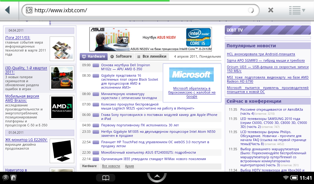Интернет-браузер имеет собственную кнопку в главном меню. Работает приложение весьма шустро, хотя функция мультитач-масштабирования и отсутствует: для этих целей используется пара клавиш «−» и «+». Нам также не удалось заставить оригинальную версию браузера отображать Flash-содержимое (хотя, забегая вперед, после перепрошивки все прекрасно заработало).