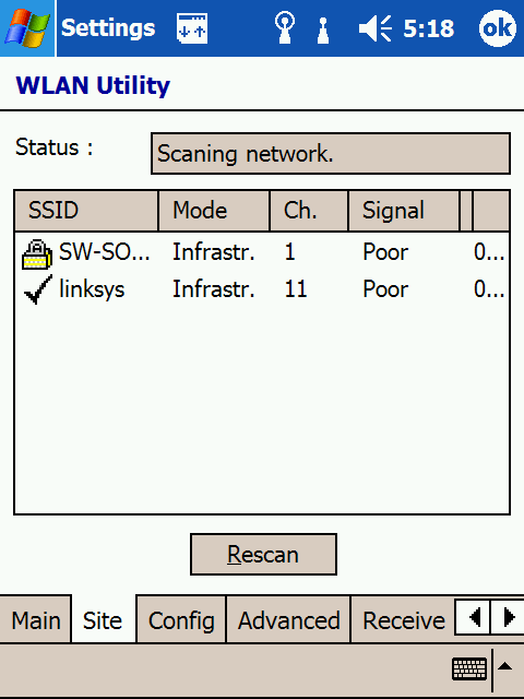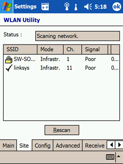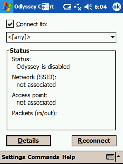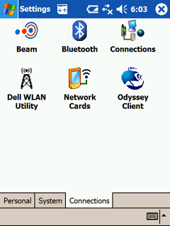Экран Today. Справа - вкладка Connections. Odyssey Client - клиент VLAN, предустановленный на Dell Axim X50v