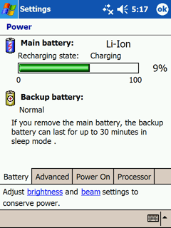 В комплекте к КПК идет Li-Pol аккумулятор ёмкостью 1100 мАч. На примере Asus A730W было рассмотрено, чем эта скромное число грозит прожорливым КПК. Быстрый процессор (624 МГц) и дополнительный графический чип дополнительно усугубляют проблему.