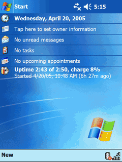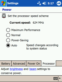 Недавно Dell выпустила обновлённую прошивку для Axim x50v (A03). Среди прочих изменений значатся улучшенное управление энергопотреблением процессора и чипа Intel 2700G. Для упокоения совести пришлось повторно позаимствовать КПК и установить English ROM A03 (русской версии на сайте Dell нет). Некоторые улучшения заметны невооруженным глазом — модуль Wi-FI стал включаться намного быстрее, пропали ошибки при работе с беспроводными адаптерами. К сожалению, показатели продолжительности автономной работы почти не изменились. Лишь в режиме Auto заметен прирост: как mp3-плеер Axim X50v стал работать по 7 часов 30 минут. При этом в Power Saving Mode КПК работает на 40 минут меньше — чудеса управления питанием. С помощью апплета Power эффект легко объясняется: в режиме Auto частота тактирования процессора может опускаться до 104 МГц, тогда как в Power Saving mode сердце КПК работает на фиксированных 208 МГц.