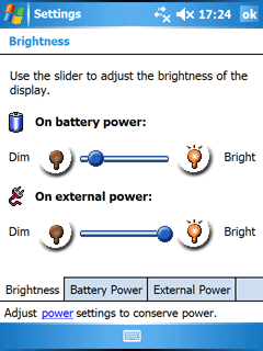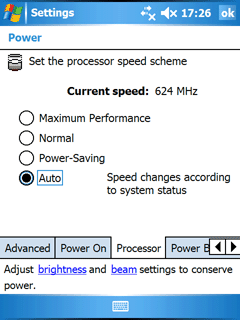 Два других профиля (power saving, normal) используются для установки нескольких промежуточных значений частоты процессора (208, 520МГц соответственно). В автоматическом режиме, во время обращения к интерфейсу и/или приложению частота кратковременно подскакивает до максимума, а затем, в несколько ступеней, снижается до необходимой минимальной для программы. При активной работе с компьютером это создает большую нагрузку на аккумулятор, рекомендацией является переход на один из промежуточных профилей работы процессора, плата — незначительное замедление работы интерфейса и программ, польза — большее время автономной работы КПК.