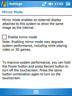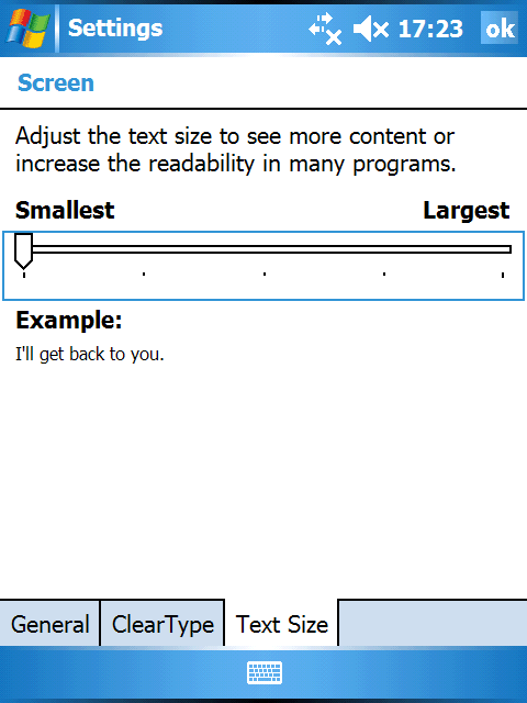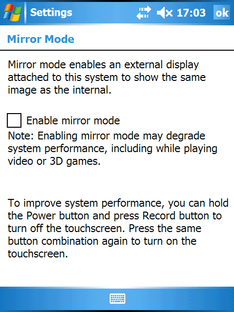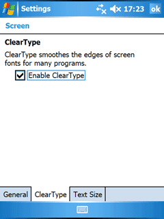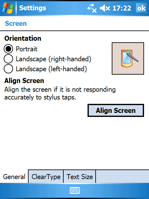 Для настройки экрана используются две утилиты: Screen и Brightness. При помощи первой можно откалибровать точность указания пером и перевести систему в ландшафтный/портретный режимы работы (поворот на 90 градусов по часовой стрелке и против). Функция ClearType присутствует лишь в виде одной настройки включено/выключено, тонкая регулировка недоступна. Зато можно изменить размер системного шрифта, вплоть до малоразличимого.