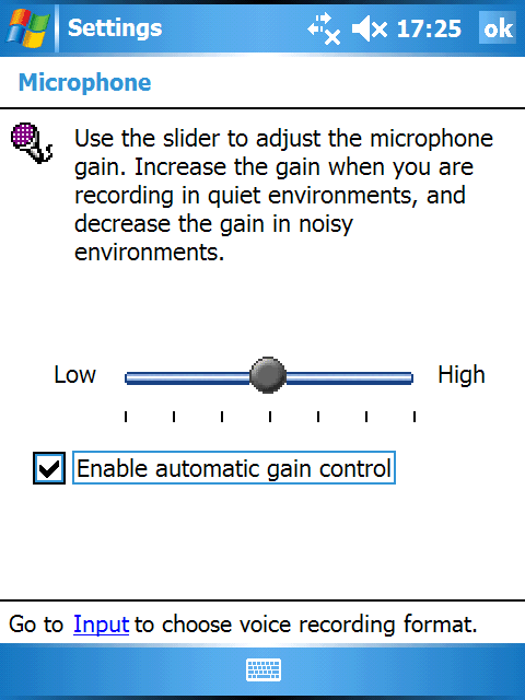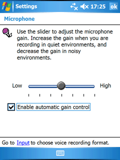 Из всех доступных настроек звука, помимо стандартной громкости и отключения системных сообщений, присутствует только утилита управления микрофоном. Единственная её задача – регулирование громкости записи. Для запуска диктофона используется аппаратная клавиша на левом торце устройства, а качество записи находится на стандартном для карманных компьютеров уровне.