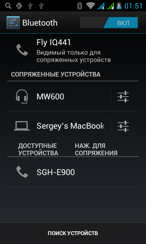 Похожая проблема с определением точных параметров смартфона возникла при изучении модуля Bluetooth. На сайте Fly указана версия 3.0, на сайте разработчика процессора — 4.0. Поддерживаются следующие профили работы: подключение аудиоустройств и стереогарнитур (A2DP), беспроводной модем (DUN), подключение к гарнитурам Hands-Free (HFP), управление аудио- и видеоустройствами (AVRCP), обмен файлами (FTP), обмен объектами (OPP), эмуляция последовательного порта (SPP), доступ к списку контактов (PBAP). При подключении к гарнитуре Sony-Ericsson MW600 коммуникатор верно транслировал названия треков, но не время их воспроизведения. Входящие вызовы отображались в виде номеров, осуществить вызов с помощью самой гарнитуры не удалось.