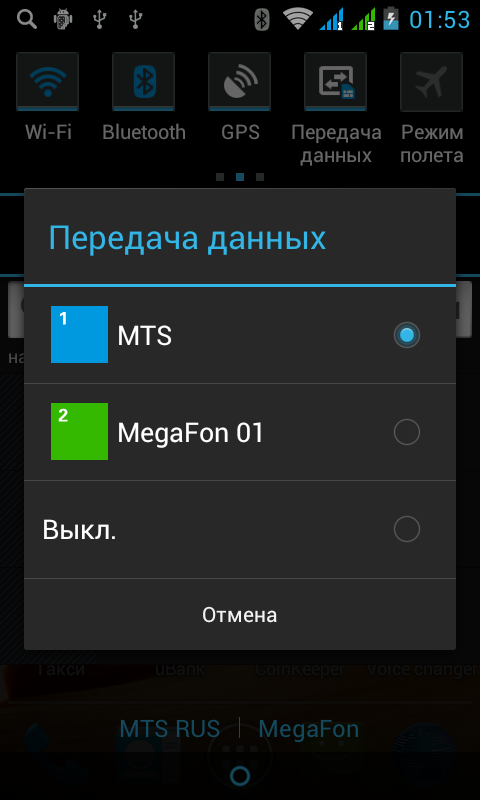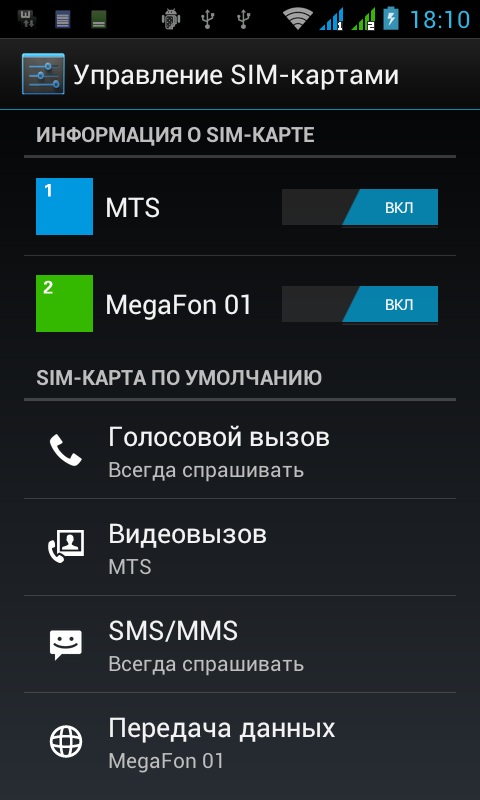 Наличие двух слотов для SIM-карт обусловило появление странички для настройки их работы в общем списке параметров коммуникатора. На этом экране можно отключить каждый модуль по отдельности, а также назначить карту по умолчанию для множества стандартных действий, как то: голосовые вызовы, сообщения, передача данных и видеовызовы. Названия операторов, к сожалению, отображаются не везде. Например, их нет в списке вызовов и сообщений, и определить, на какой именно номер поступило то или иное сообщение, можно, лишь запомнив, какая именно карта вставлена в слот SIM1 и SIM2 — именно эти малоинформативные названия отображаются вместо названия операторов. Везде, где есть неопределенность, какую именно карту использовать (если не назначена карта по умолчанию), операционная система демонстрирует диалог с выбором. Например, он появляется, когда пользователь включает передачу данных по мобильной сети.