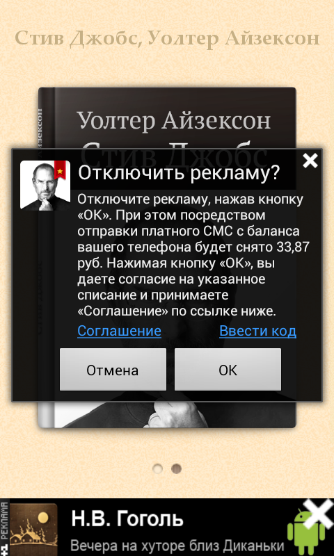 Библиотека литературы FlyBook демонстрирует занятный подход к распространению цифровой литературы. Вместо того чтобы оплачивать покупку книги, вам предлагается скачать ее и читать бесплатно, но при условии постоянного просмотра рекламы в виде баннера в нижней части экрана. Избавиться от него можно, лишь расставшись с небольшой суммой денег посредством отправки платного SMS-сообщения. Опять же интересно, что каждая книга скачивается и устанавливается в виде отдельной программы, и, таким образом, единожды заплатив, вы не увидите больше рекламы — но только в одной конкретной книге. Для комфортного просмотра всех последующих литературных произведений процесс расставания с деньгами придется повторять каждый раз.
