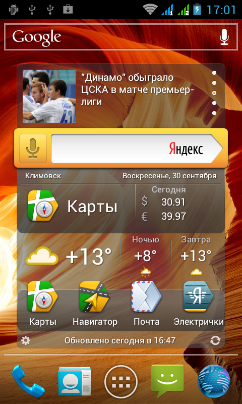 Само собой, коммуникатор, нацеленный на российский рынок, не мог обойтись без нескольких приложений отечественного гиганта поиска, навигации и прочего — Яндекса. Его огромный виджет полностью занимает еще один домашний экран операционной системы (всего этих экранов-вкладок пять). Изображение виджета красноречиво демонстрирует его возможности: поиск, новости, курсы валют, погода и иконки для загрузки других программ — все сервисы собраны в одном месте. Впрочем, есть еще Поиск Яндекса, который также встроен в панель уведомлений системы.