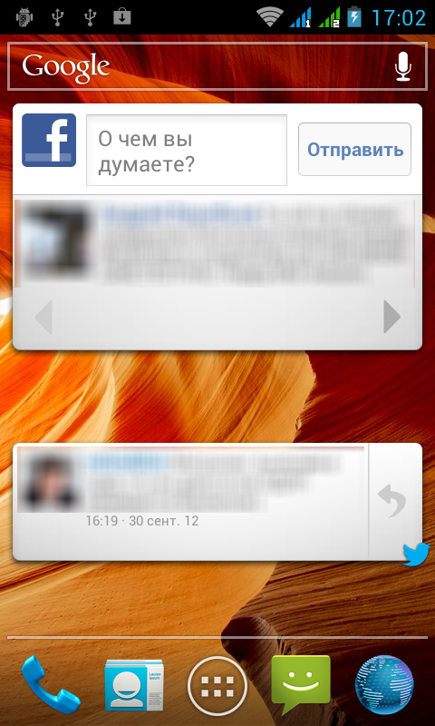 Прежде всего разберемся, какие приложения получили прописку в штатной прошивке Fly IQ441. Большинство из них хорошо известно тем, кто хоть раз выходил на просторы «всемирной паутины» и сталкивался с таким понятием, как социальные сети. Значки клиентских программ двух самых популярных в России «социалок» вынесены на один из основых экранов системы — речь идет о сервисах Одноклассники и Вконтакте. На другом экране располагаются виджеты двух других крайне популярных сервисов — Facebook и Twitter. Таким образом, новоявленный владелец Fly IQ441 без особых затруднений может начинать делиться впечатлениями о своем приобретении во всех более-менее популярных соцсетях сразу же после первого включения коммуникатора.