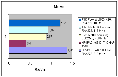 Причина столь высокого показателя вполне обычна качественная подсистема памяти позволяет коммуникатору хорошо справляться с операциями чтения/записи данных, и соответственно демонстрировать высокие показатели в скорости прорисовки видео. Правда, здесь возможен еще один эффект: пониженное разрешение экрана означает уменьшение площади прорисовываемого изображения. В КПК с VGA-экранами наблюдается очень существенное падение производительности именно по этой причине, так что высокие результаты в тестах hw6510 могут иметь ту же природу. Впрочем, конечный результат в любом случае один hw6510 достаточно быстр, его интерфейс реагирует на действия пользователя мгновенно, и этого вполне достаточно.