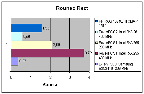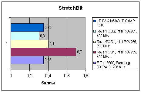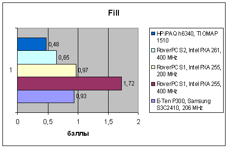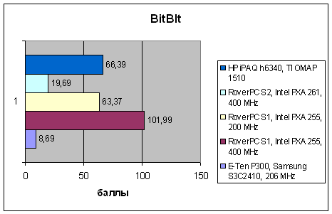 А вот графическая подсистема на платформе, задействованной в h6340, очень хороша. Операции с растровой графикой, в особенности, заключающиеся в простом заполнении видеобуфера, выполняются достаточно быстро, в этом отношении продукт от HP уступает только первому коммуникатору от RoverPC/«Версия», в котором графика была реализована очень грамотно. Более новый коммуникатор RoverPC/Lenovo в этом отношении намного медленнее, хоть у него и 400-мегагерцевый процессор. Разумеется, тесты с масштабированием графических объектов выравнивают положение, выводя вперед системы с более быстрыми CPU, но h6340 и здесь держится вполне достойно.