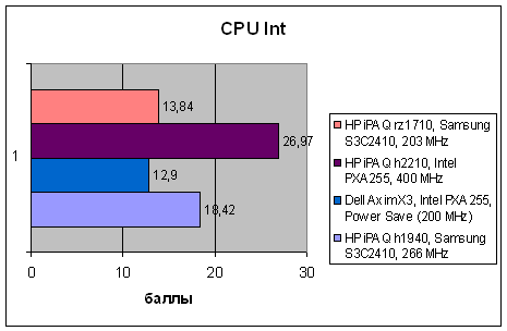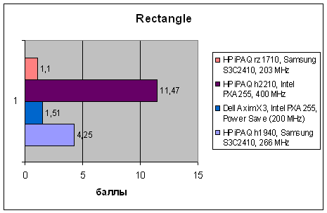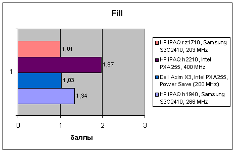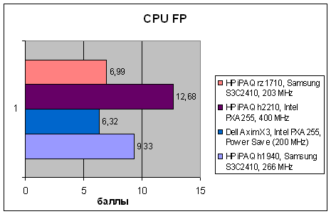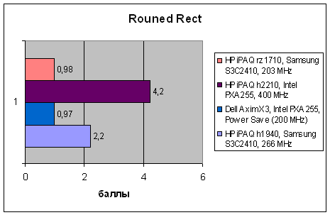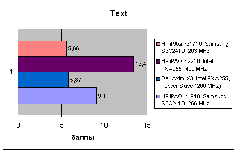 Как видим, производительность 203-мегагерцевого Samsung незначительно выше, чем у PXA255 200 MHz – эту разницу нельзя относить на счет 3-мегагерцевого различия в тактовых частотах. Большая производительность – достижение архитектуры Samsung, хотя преувеличивать ее значение ни в коем случае нельзя – слишком невелик разрыв, так что можно считать, что 200-мегагерцевые процессоры Intel и Samsung демонстрируют равное быстродействие. И, тем не менее, быстродействие 200-мегагерцевой системы значительно ниже, чем даже 266-мегагерцевой.