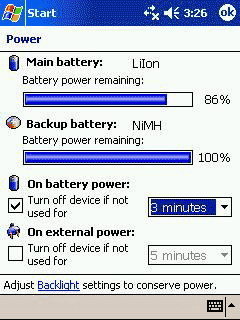 С помощью пакета тестов продолжительности автономной работы КПК из программы Spb Benchmark удалось оценить характеристики энергопотребления h1940. К сожалению, и здесь проявилась неполная совместимость с Windows Mobile 2003  тестовое приложение не смогло автоматически запустить Windows Media Player, необходимый для измерения показателей в распространенных режимах «воспроизведение видео при максимальной яркости подсветки» и «воспроизведение MP3 при выключенном экране». Измеренное нами время работы при эмуляции «стандартного» использования, включающего запуск Pocket Word и File Explorer, и максимальной яркости подсветки составило 3 ч 45 мин. Это не очень высокий показатель.