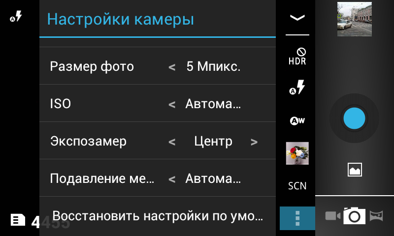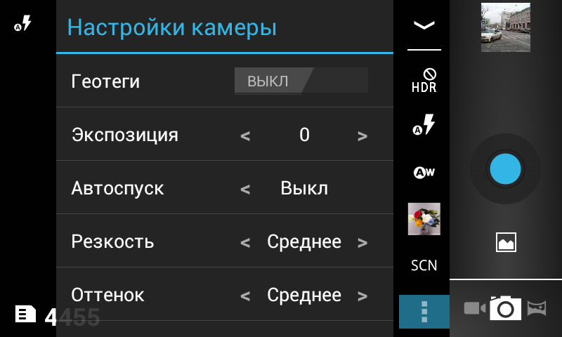 Внешний вид программы управления съемкой обманчив. Основные настройки вынесены в виде нескольких иконок на главный экран — тут все интуитивно понятно. Детальные же настройки съемки спрятаны в витиеватом и многоуровневом меню, которое вызывается касанием небольшого значка рядом с переключателем режимов работы камеры. Этих настроек великое множество: начиная с размеров снимка и уровня светочувствительности (ISO) и заканчивая геотегами GPS и тонкой подстройкой контраста фотографий.