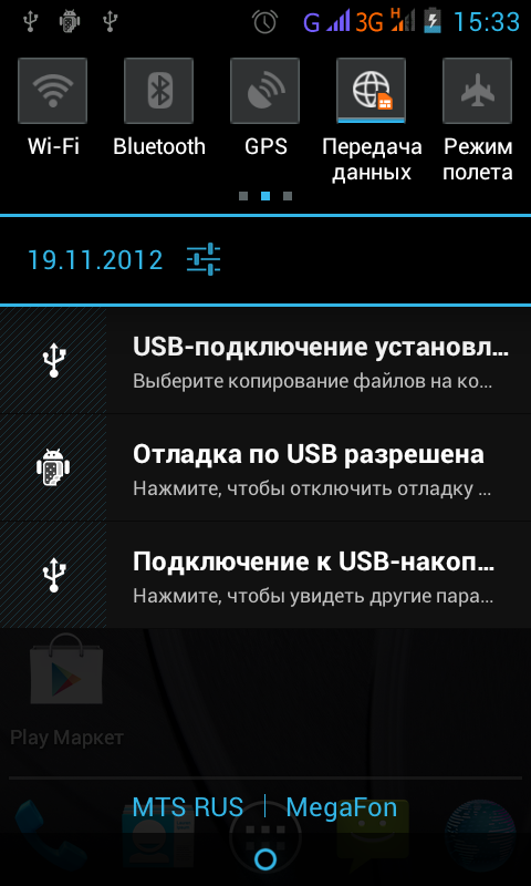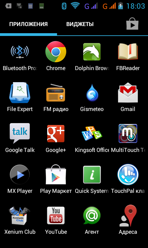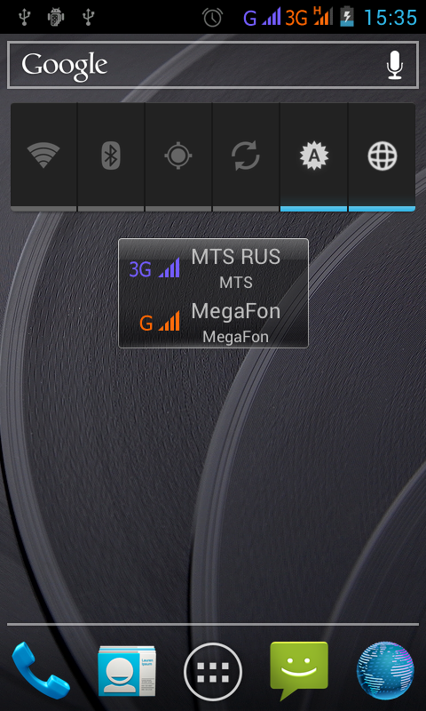 В нижней части экрана расположены иконки наиболее используемых программ и кнопка вызова списка установленных приложений и виджетов — тут все стандартно. Сверху находится область уведомлений, в которой, наравне с другой информацией, отображаются индикаторы работы модулей сотовой связи и передачи данных. Рядом с ними находятся индикаторы сетей, которые информируют владельца смартфона, в каком режиме (2G или 3G), работает тот или иной модуль. Казалось бы, узнать это также позволяет отдельный виджет, предустановленный на основном экране системы, но на самом деле у него другая задача — показывать владельцу, какой модуль из двух теоретически способен работать в сети 3G. С его же помощью можно быстро попасть в меню управления двумя модулями связи.