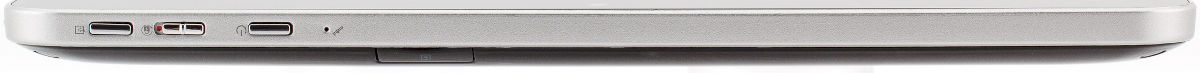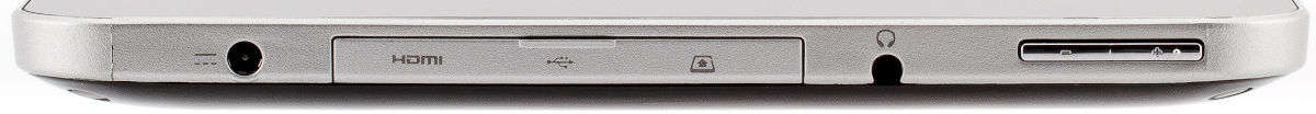Боковые ребра задействованы неравномерно: левая часть планшета освобождена от каких бы то ни было интерфейсов, в то время как ее правая коллега ими буквально перегружена. Итак, здесь находятся: разъем для подключения блока питания, 3,5-миллиметровый выход для наушников, регулятор громкости, а также общая заглушка для порта HDMI, USB-хоста и слота карты памяти MicroSD.