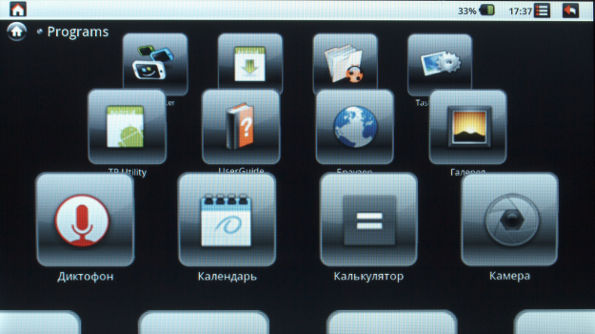 За кнопкой Programs прячется объемный сборник установленных на планшете программ. Здесь найдется AppCenter (аналог Android Market), iFileManager (браузер файлов), Task Manager (своеобразный диспетчер задач), TP Utility (настройка сенсорной панели), Диктофон, Календарь, Калькулятор, Камера, Поиск, Часы. Вот и весь список необходимого, на взгляд разработчиков, ПО. В принципе, список достаточный для множества пользовательских задач, единственный вопрос, который возникает при ознакомлении с ним: «Чем же помешали штатные приложения Android?» — такие как Gtalk и Gmail.