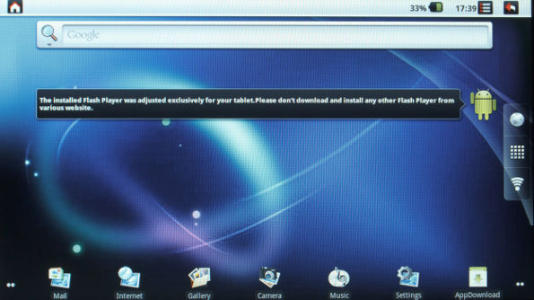 Первый запуск устройства позволяет произвести его начальную настройку: выбрать регион, часовой пояс, язык интерфейса, подстроить часы и календарь. Интересно, что сразу же после выбора языка система предлагает для ознакомления лицензионное соглашение на английском, что выглядит весьма некрасиво по отношению к людям, не знакомым с иностранными наречиями. После первичной настройки система выводит грозное сообщение о том, что на планшете установлена специальная версия адаптированного Flash Player и установка сторонних плееров не рекомендуется.