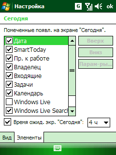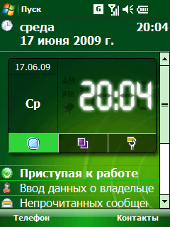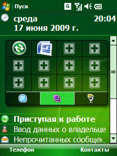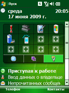 Первое, что попадется на глаза приложение SmartToday. На трех вкладках виджета для экрана Today располагаются: часы с календарем, матрица ярлыков избранных приложений и набор значков инструментов настройки коммуникатора.