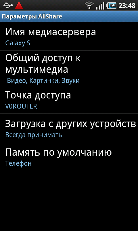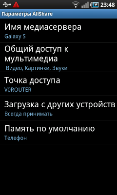 Программа AllShare отвечает за открытие доступа к медиаконтенту, хранящемуся в памяти коммуникатора, а также за получение доступа к аналогичным данным на других коммуникаторах и компьютерах в сети (используется технология DLNA).