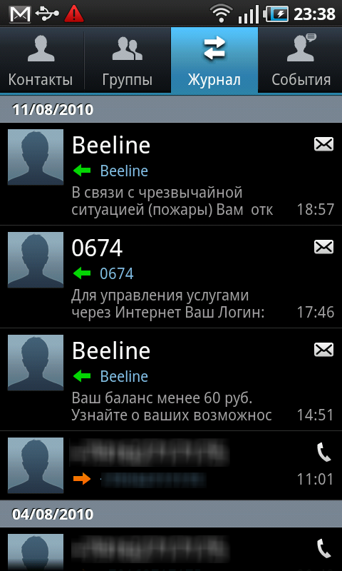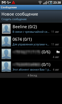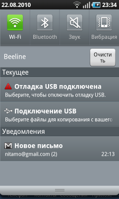 Если потянуть за панель в верхней части экрана, то взгляду предстанет окно, содержащее кнопки управления беспроводными интерфейсами коммуникатора, список сообщений системы и уведомлений программ.
