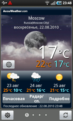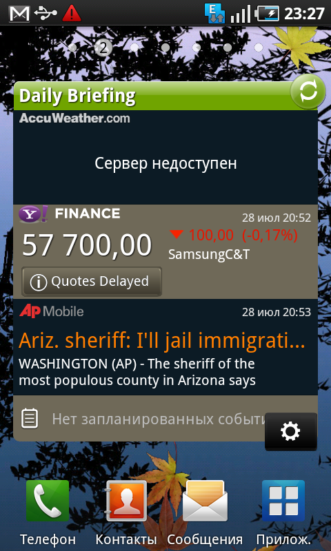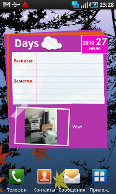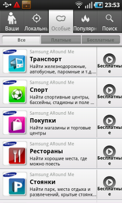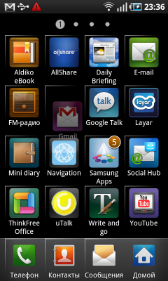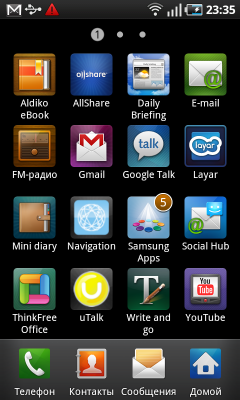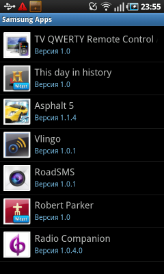 Помимо встроенных виджетов Android, в Galaxy S установлено несколько виджетов Samsung: прогноз погоды, календарь, новости, заметки, социальные сети, избранные контакты. Их список пополняется при помощи программы Samsung Apps. Кроме виджетов, в ней можно обнаружить и загрузить несколько обычных приложении и игр. В настоящий момент список программ небольшой, но возможно, в дальнейшем он будет расширяться, да и никто не мешает воспользоваться Android Market.