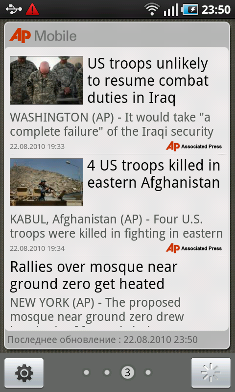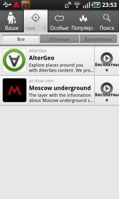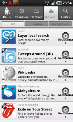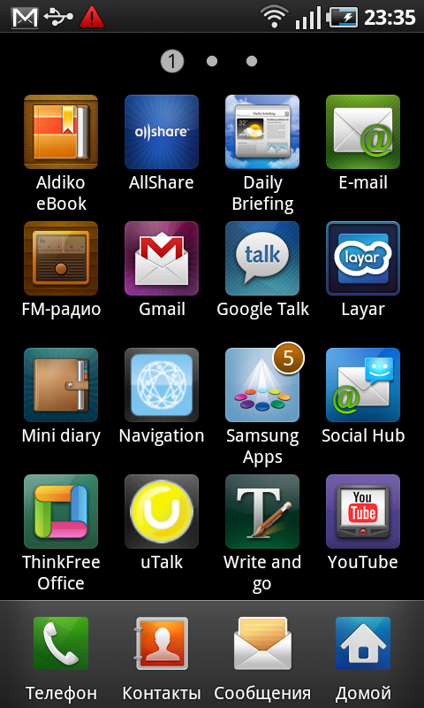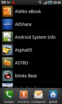 Открывающийся при помощи отдельной кнопки на основном экране системы список приложений неуловимо напоминает собрата в коммуникаторах iPhone. Чувство дежа вю усиливается, когда приходит понимание, что список программ в Galaxy S пролистывается не снизу вверх, как на всех прочих Android-коммуникаторах, а слева направо, как в iOS. Сами прямоугольные иконки выглядят ровно так же, как и в «яблочных» смартфонах. Степень сходства настолько велика, что не разбирающийся в коммуникаторах человек может легко спутать мобильные компьютеры, если ему показать только этот экран. Разработчикам Samsung не стоит останавливаться на достигнутом — необходимо добавить следующие возможности: удаление программы перетаскиванием значка в корзину, объединение программ в группы, информирование о статусе программы на ее значке. Впрочем, последнюю возможность уже реализовали.