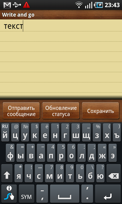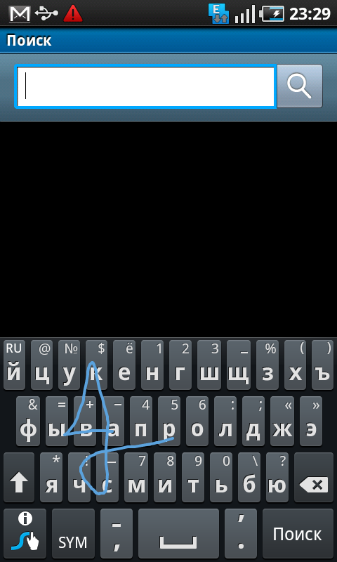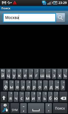Прежде всего, стоит обратить внимание на виртуальную клавиатуру. Технология Swype, используемая для помощи в наборе текста, обеспечивает быстрый ввод информации за счет автоматического определения слова после перемещения пальца по определенным кнопкам клавиатуры. В действительности процесс ввода текста выглядит следующим образом: владелец двигает пальцем по экрану с клавиатурой, не отрывая его, начиная с первой буквы в слове и до последней по очереди. Логика программы, основываясь на траектории движения пальца и попадающих на нее кнопках, подбирает искомое слово из встроенного словаря. Если оно в словаре присутствует — текст автоматически появляется на экране. Вероятность правильного распознавания тем выше, чем слово более распространено. Проблем с вводом английского текста и русского не возникло, обычные фразы распознаются уверенно.